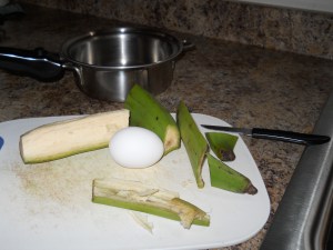 Come back inside, finish drinking my cleansing water (my mother’s suggestion to flush all the stuff out of your system, before you put back more stuff in your stomach), then go upstairs to publish my posting, (you see how I have all of you in my mind so early in my day) go back downstairs to peel my plantain, and get my breakfast going.  Add one egg to the water, and let it simmer for 1/2 hour.