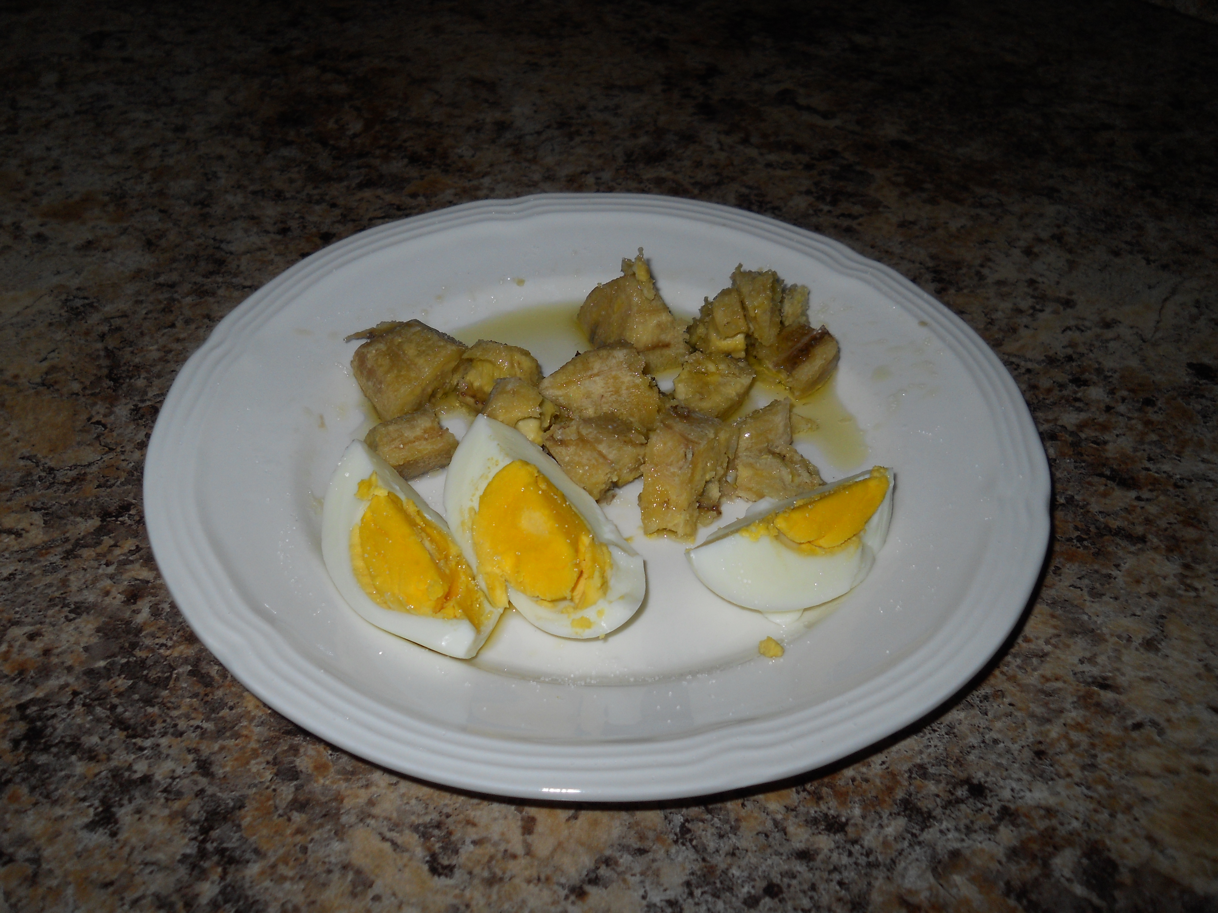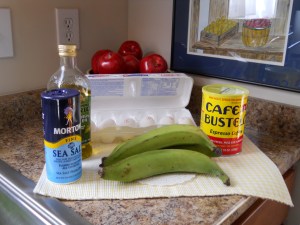 Start to read the newspaper, get some of that delicious coffee (it really gets my day in a good mood), keep on reading the paper, and then the timer in the micro lets me know my healthy good for me breakfast is ready.  I cut the plantain in small pieces, put some xtra voo, sea salt and then it is ready to enjoy.  I only have eggs three times a week.  Cholesterol, you know.  All the rules change once you have reached 50.  After that, it is body vs mind.  And you know who wins most of the time.