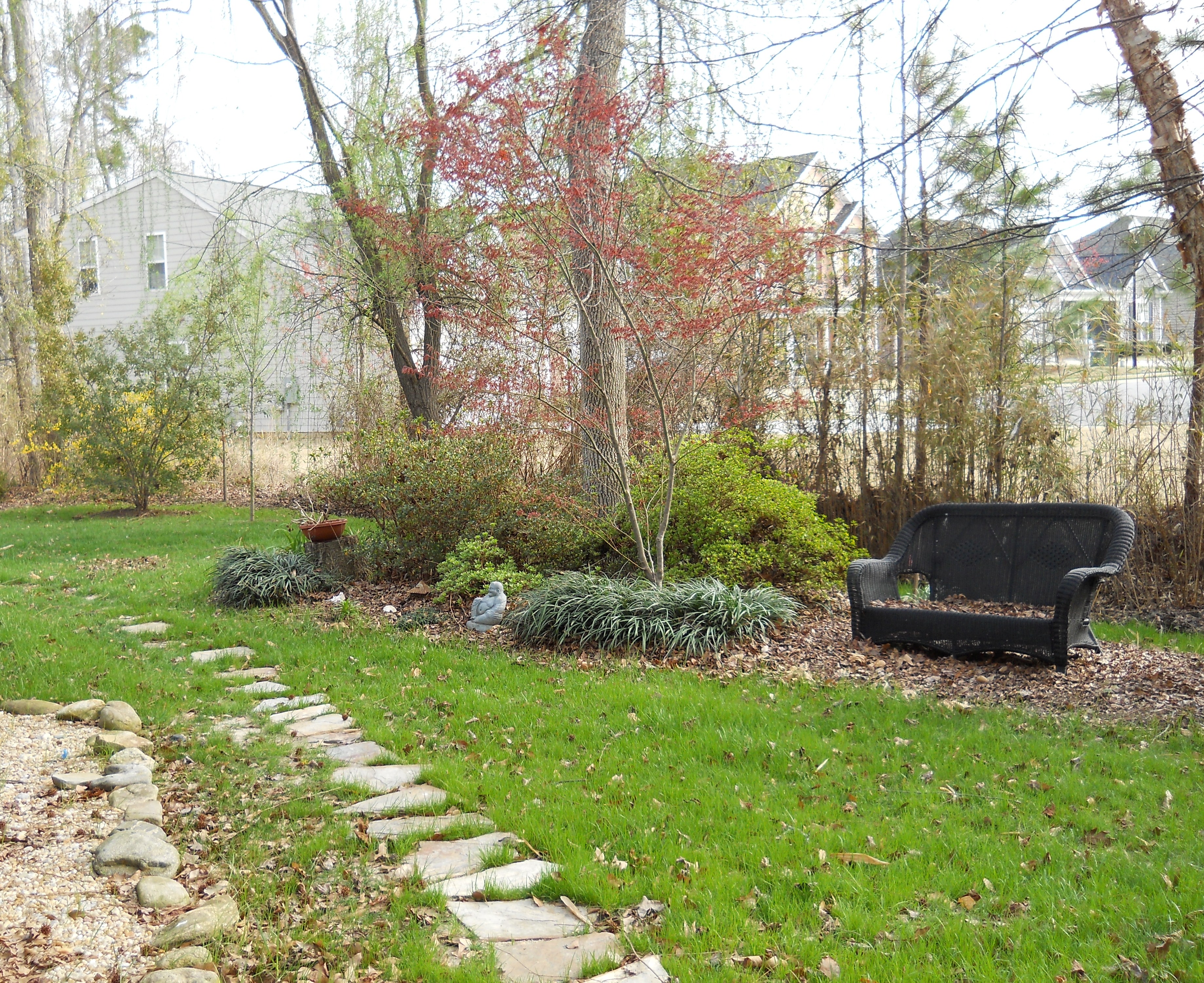 Let’s go back to pretty things.  This is a section of Miss Raylene and the very temperamental artist, Mr. Richard’s backyard.  It is like a little park.  There is a laughing Buddha in there always smiling at you.  Do you know why the Buddha is always laughing?  Because he thinks is funny that we believe that life should be without any problems.  That’s very laughable to him.  I think he has a very good point.