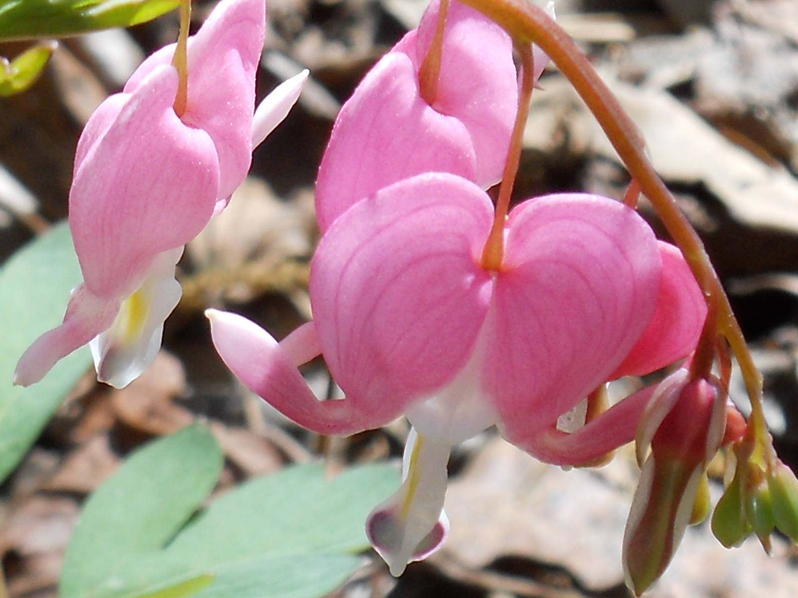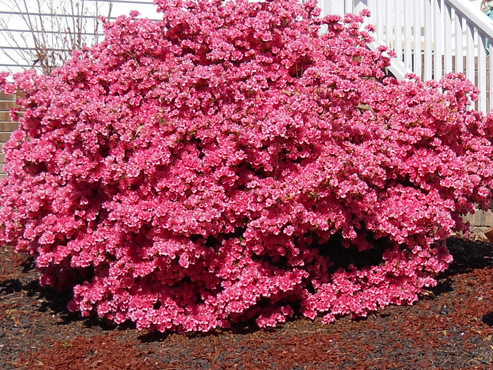 An azalea bush on the left and a bleeding heart on the right. I had never seen one before. If you look really close the little flower is in the shape of a heart, and has a section at the bottom that looks like a tear. Simply beautiful!