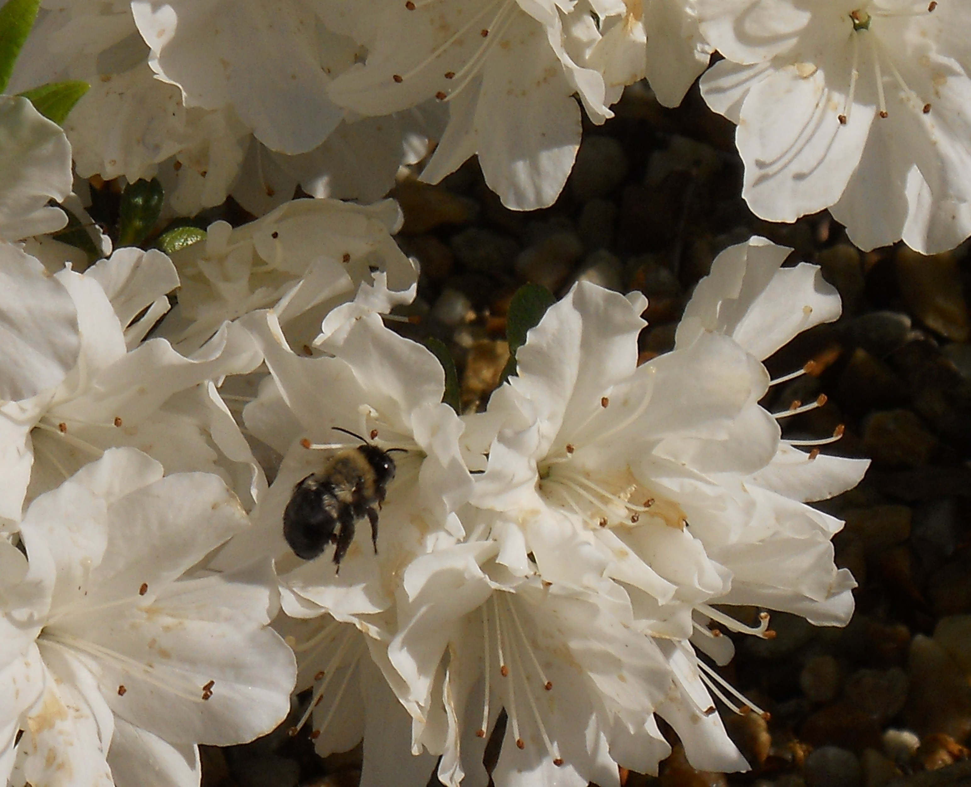 Now that we have it clear about avatars and clones, I am leaving you with two photos of Lolita the friendly bumble bee. These two I captured early last week in Miss Raylene’s garden’s white azaleas. I just love my camera! It was cheap too.