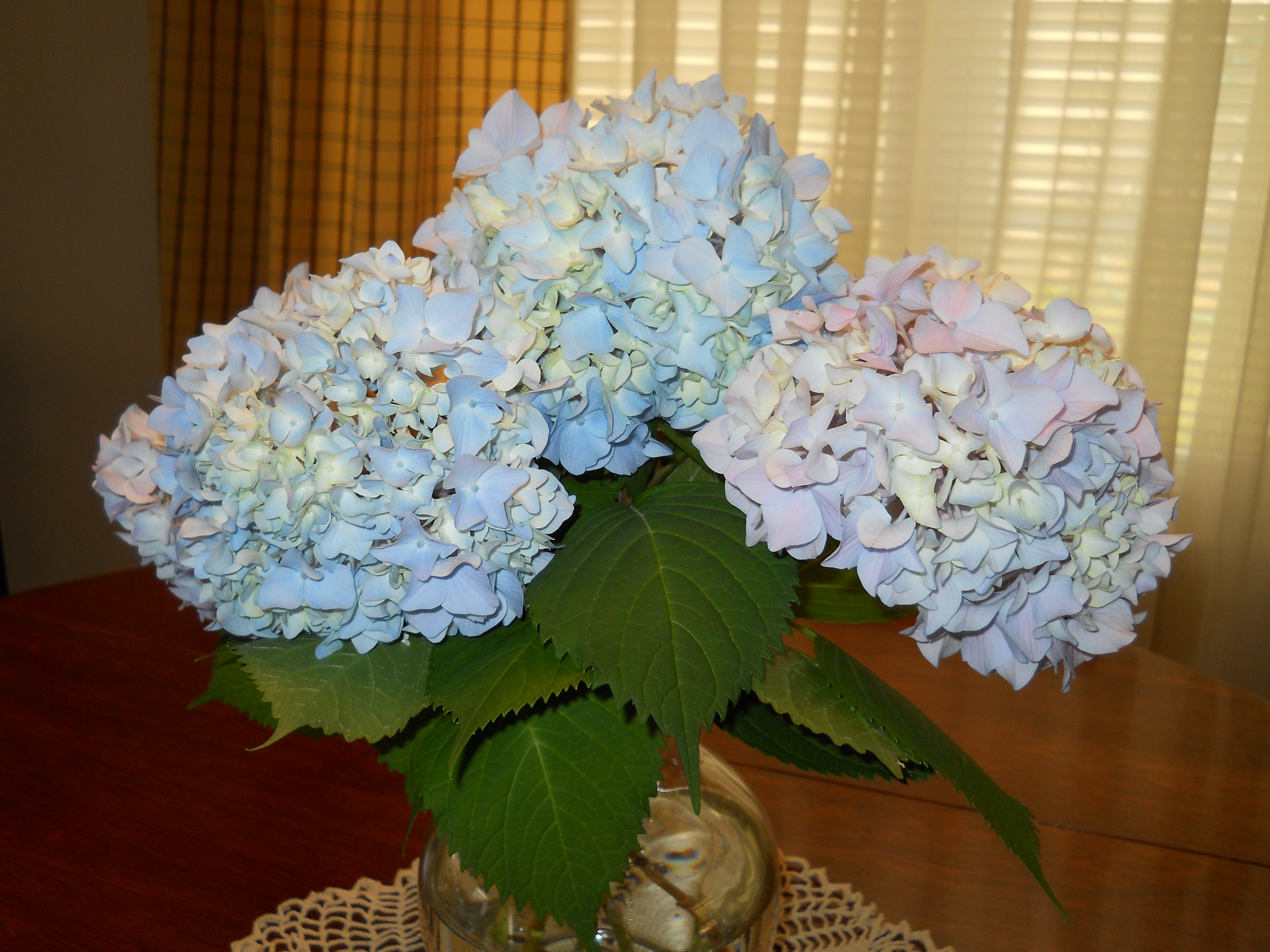 These hydrangeas are from Miss Raylene’s garden, now gracing my eyes and my table. I believe you can transmit appreciation and admiration to flowers, animals and most important, to other human beings. No questions about it. Look at the balance in the different shades of colors on these flowers. No one or anything can create such harmonious display of color and fragrance, when it’s possible. It makes me ponder about the abundance of gifts bestowed upon us by our Creator.