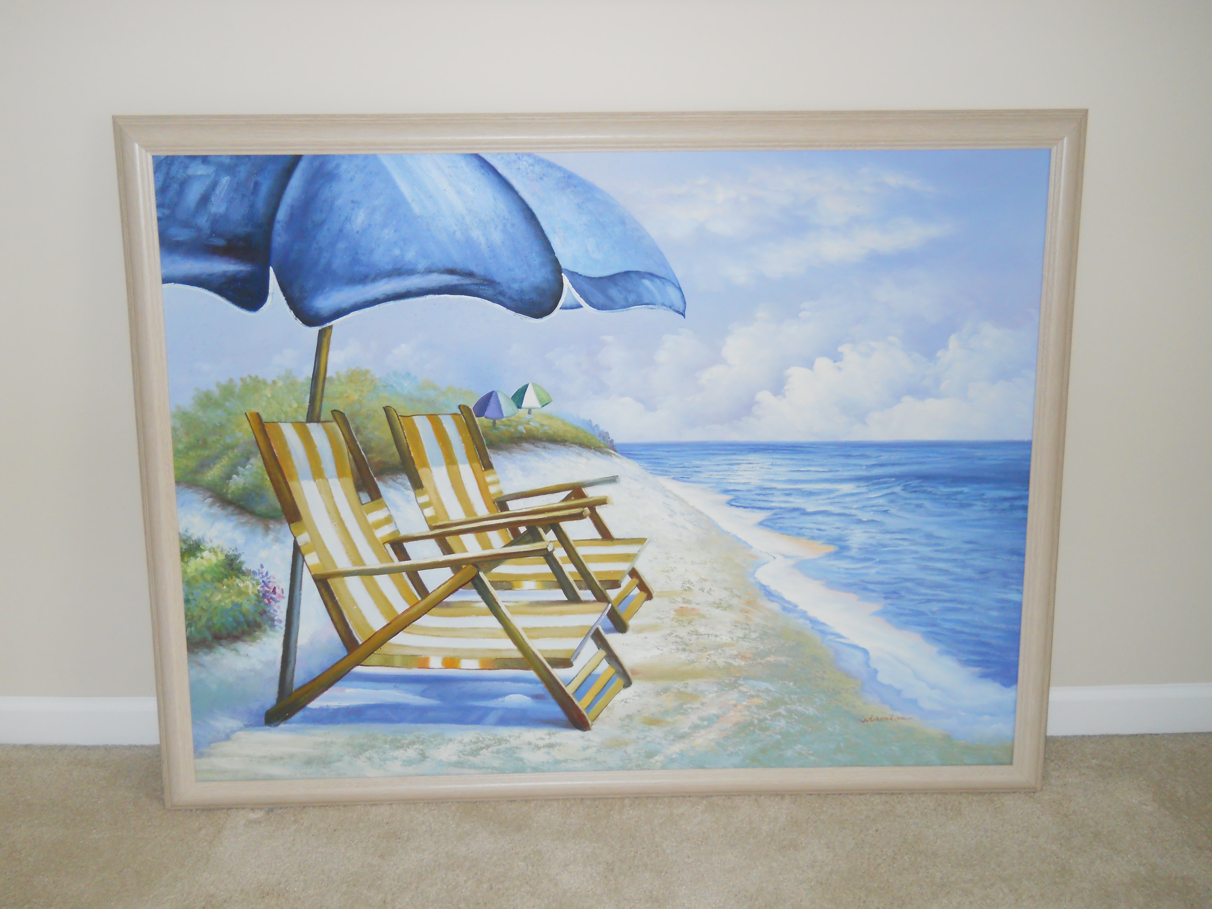 This is as close as I am getting to a beach right now. I love this painting because it gives me the feeling of peace, tranquility and serenity. Same things, just sound different. It is a big painting, that probably I will have to depart with because I won’t have any space for it in my new digs. Two chairs, did you notice…, that was supposed to be Ron and me enjoying the sun at a beautiful beach somewhere in paradise.