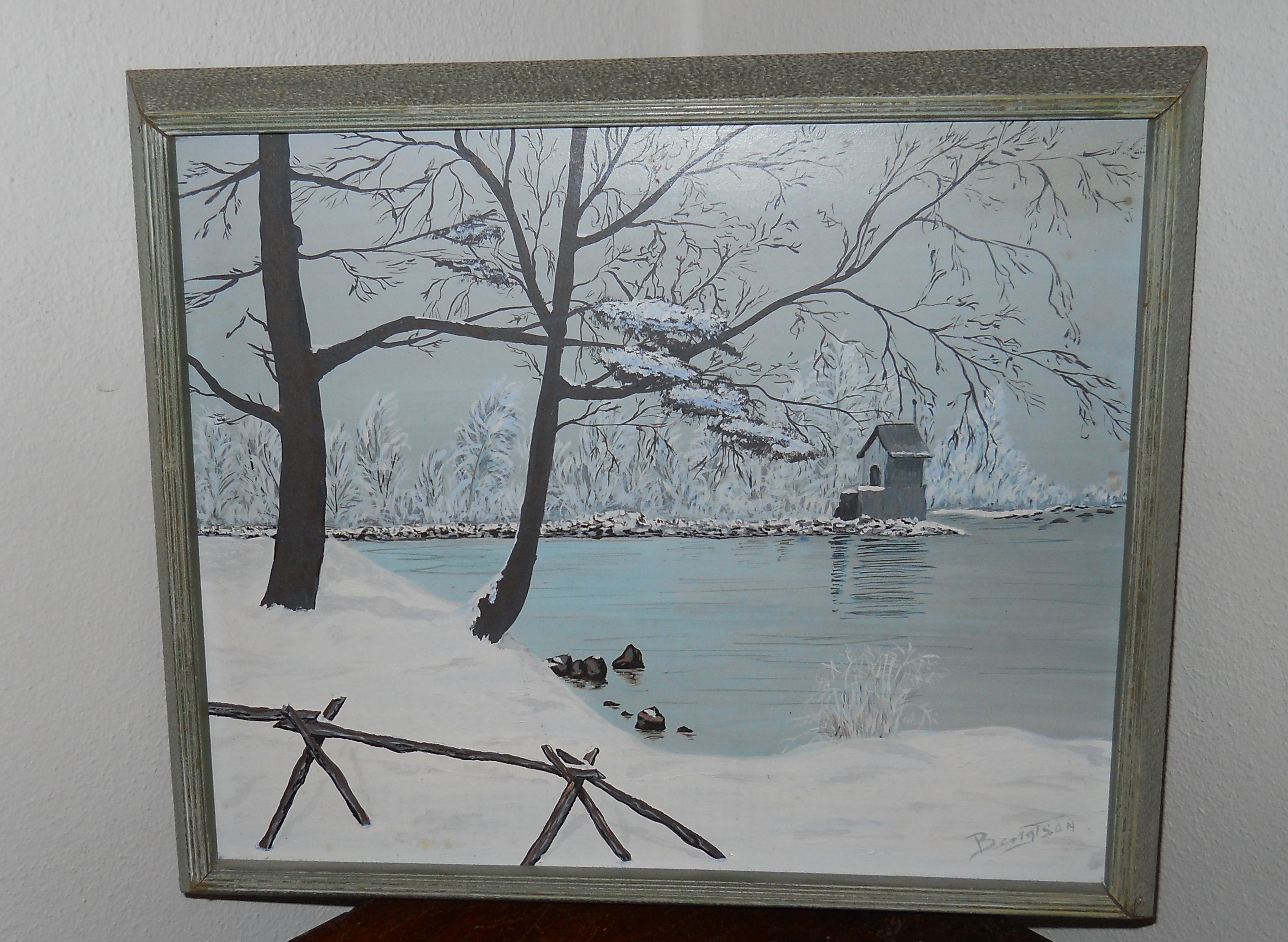 What a beautiful winter scene!  Did you notice the different tones of gray? If you see the picture closer, you can notice the fine details this painting has.  I noticed also the color scheme that he used in the painting, from many years ago, he used the same coordination on the eagle piece of art showing at the beginning of the posting.  This one is one of the many paintings he has done throughout his lifetime.  What a talented individual he is.