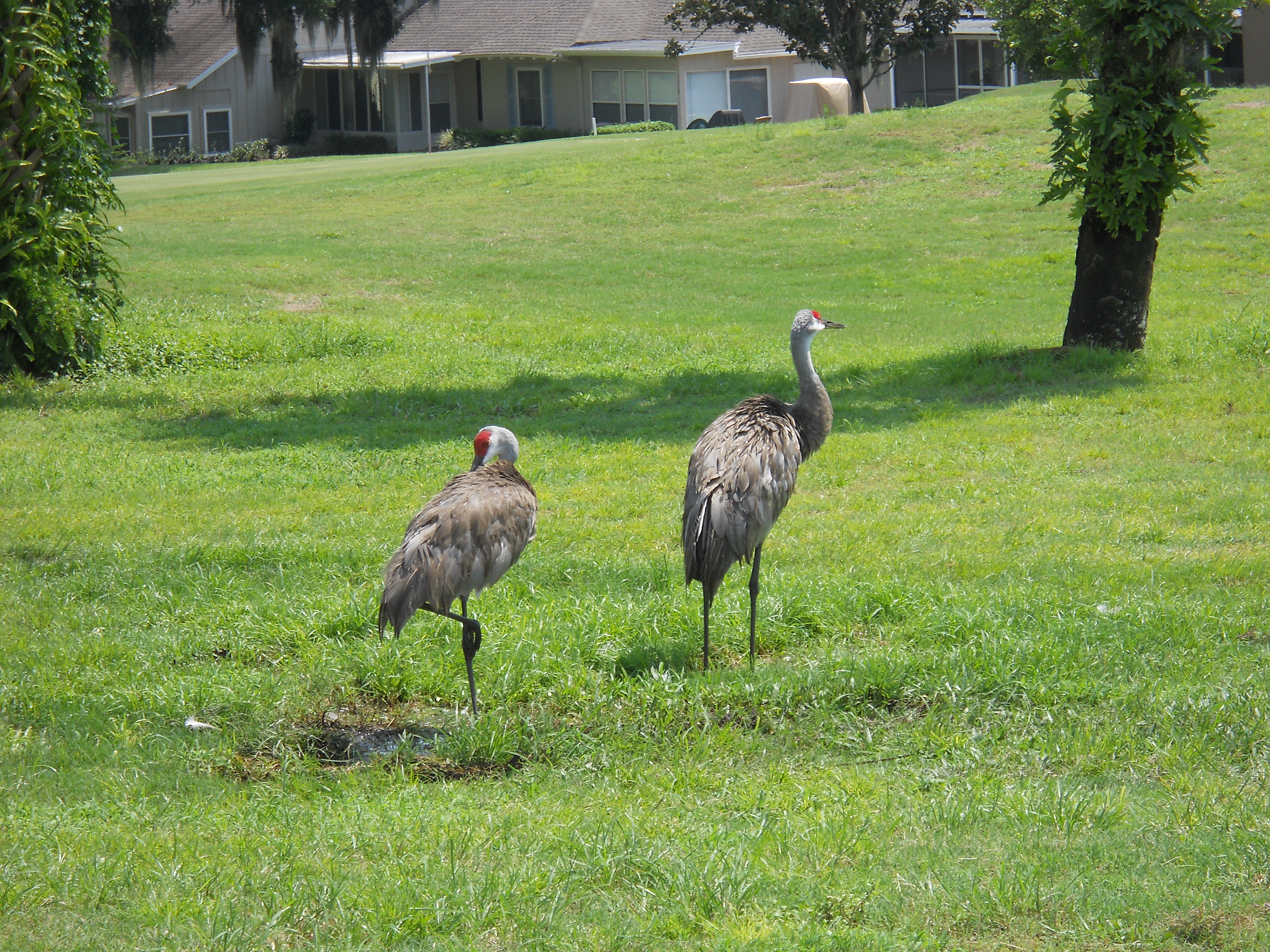 1. Those are Sand Hill Cranes. Very watchable bird. They are coming back big time in Florida. You have heard of the Whooping Crane that was almost extinct and was reintroduced by being tricked into imprinting on the Sand Hill Cranes. Note the red heads. They usually have 2 chicks and stay with them for a long time. They make a clicking sound with their beaks. You should get a book on Florida birds and try to see how many bird sightings you can “collect”. We had a rare crane at our lake a few days ago.