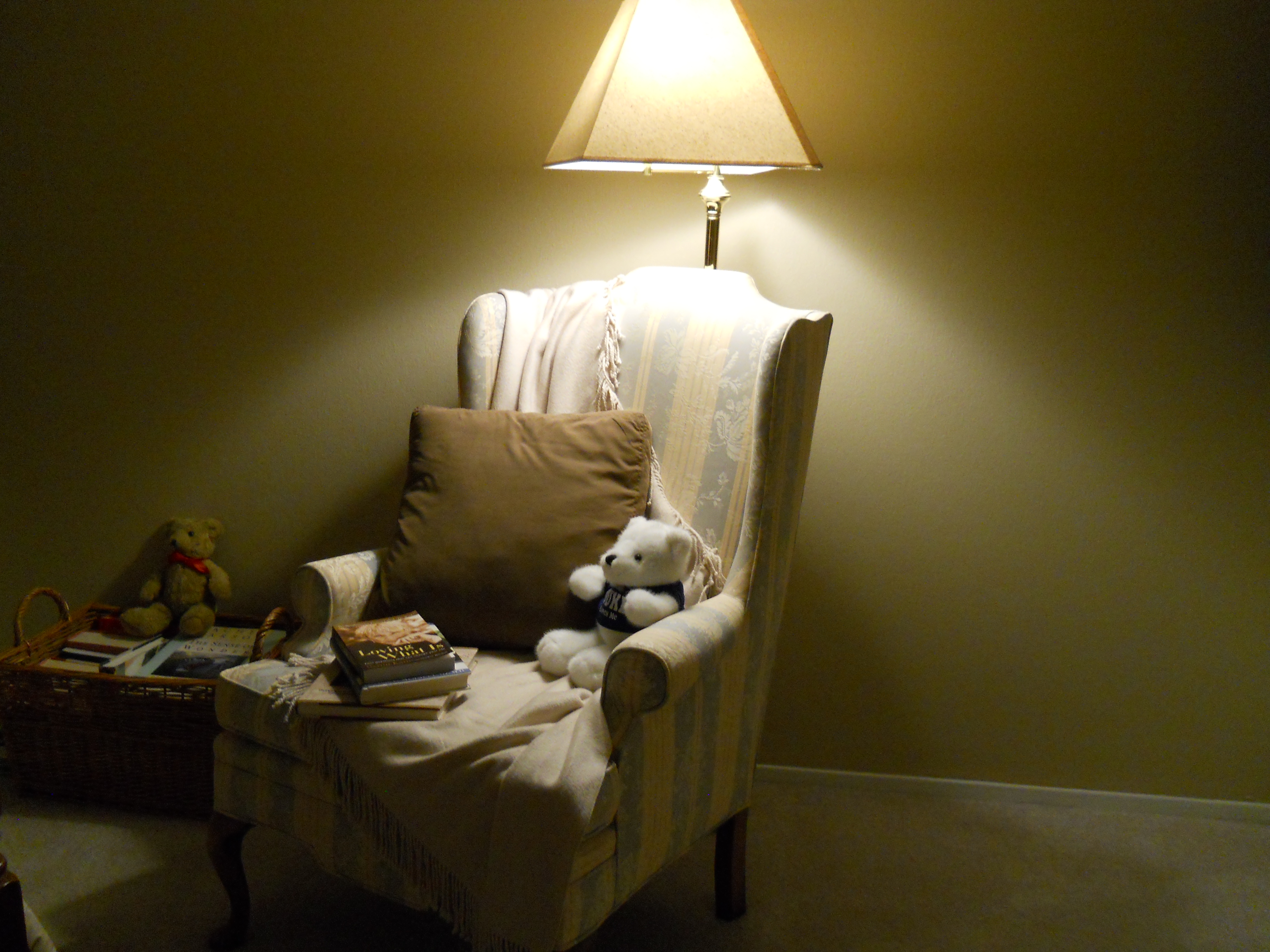 I love the texture of the fabric of the chair, how comfortable it is, especially for my back, and the lamp just gives me the right amount of light that I need.  Also, it makes me be at ease with everything.  It is also my pondering place where I go through my list of gratitude for the day.