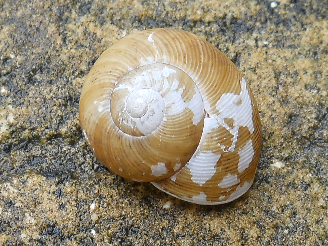 1. I think that is an apple snail which is aquatic. Many times a bird will eat them and drop the shell on land. When you picked it up, did it feel empty. You should have been able to see the “foot” or muscle. We find them on our dock all the time. They lay their eggs on aquatic grasses up about a foot off the water. They are slightly pink and maybe 1/6 the size of an English pea. There will be a line of them up to about 25. They are an important part of the balance of nature in the zone from shore out to about 4′ in our lakes.