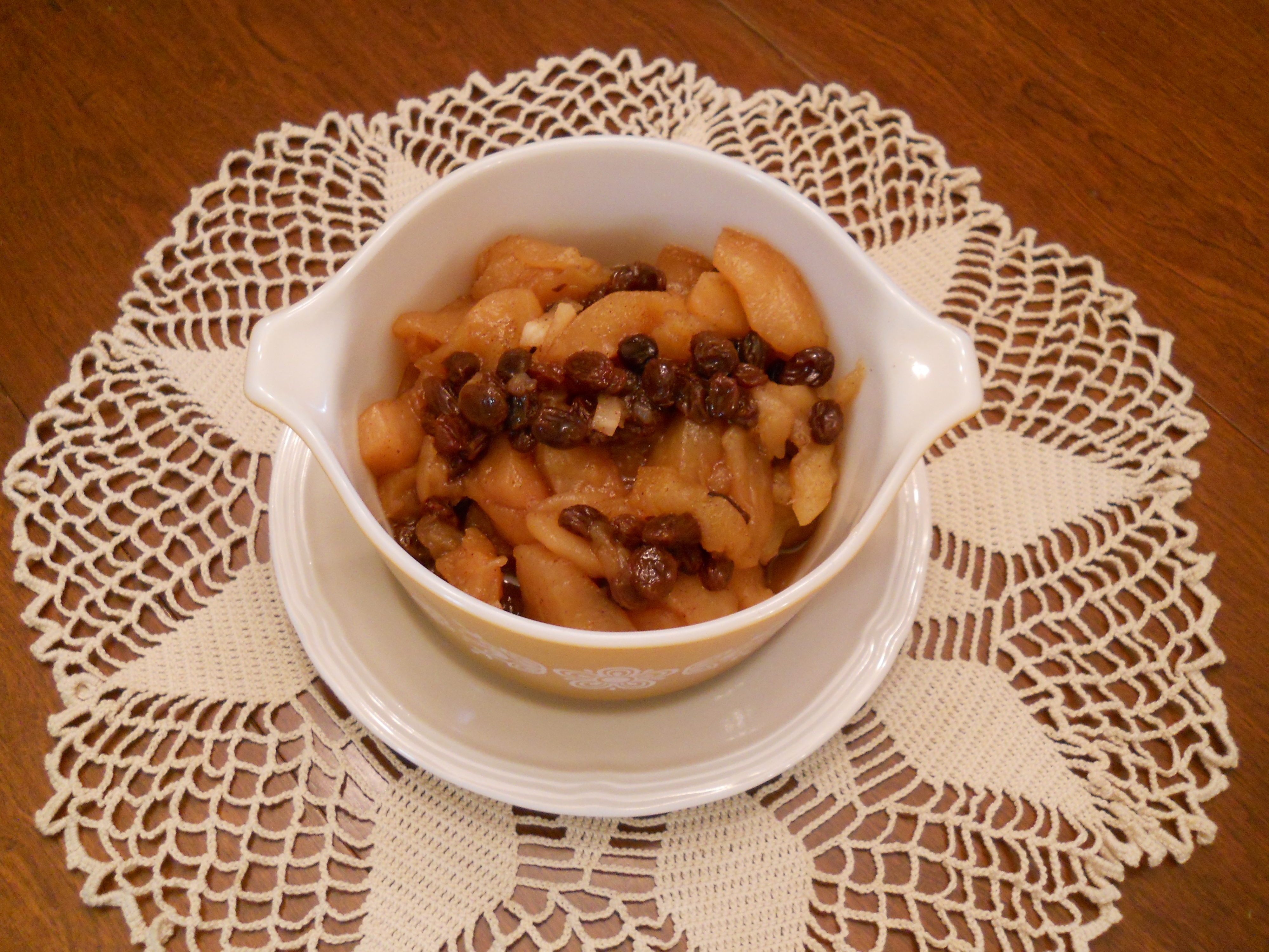 You peel them, slice them, put them on a pan with nothing in it, add the raisins, some cinnamon, some sugar, a pinch of salt, one teaspoon of vanilla extract, little, little salt, and if you have crystallized ginger, just a bit. Put all the concoction to simmer very low, because it has to create a steam, no fat whatsoever. I do not have margarine, butter or even other regular oil. Only extra virgin olive oil, and I did not think that was proper. I put olive oil on everything I cook, except sweets.